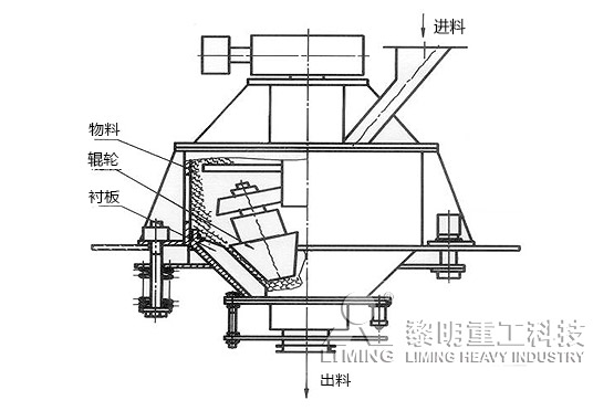 直通式離心磨采用中速中壓、連續反復料床層壓粉磨原理,物料上進下出,粉磨和分級分別進行。該機上部傳動,帶動主軸旋轉,使輥輪在環錐形內襯中轉動(輥、襯之間間隙可調,不接觸),物料從上部給入,靠自重下落。由于上部推料和下部堵料相互作用,物料在輥輪與襯板之間形成料層,料層受到輥輪的反復滾動碾壓而成粉末,最后從磨機的下部自動卸料。
