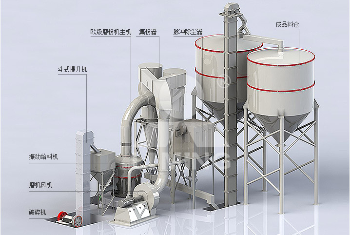歐式磨粉機整套設備主要由主機、選粉機、風機、顎破、畚斗提升機、電磁振動給料機、儲料倉、布袋除塵器、管道裝置、旋風集粉器、電控柜、電機等組成。