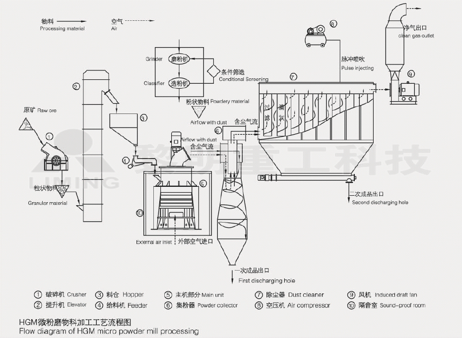 HGM環(huán)輥微粉磨主要包括:主機、選粉機、擴散式旋風集粉器、高壓風機、消聲器等。根據工藝要求可選配破碎機、提升機、儲料倉給料裝置等輔助配套設備。