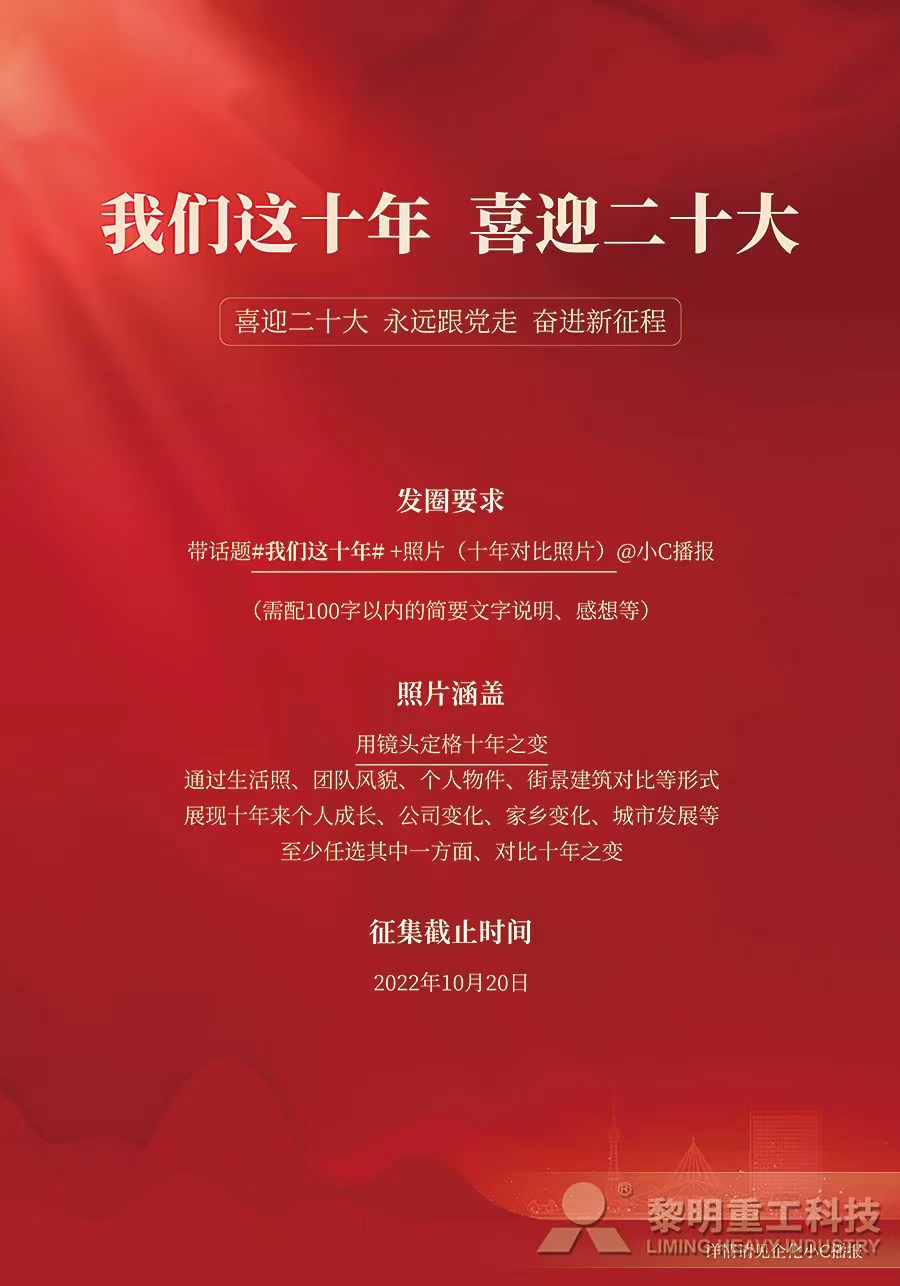 黨的二十大是在關(guān)鍵時期召開的關(guān)鍵會議,習近平總書記的講話是我們邁上全面建設(shè)社會主義現(xiàn)代化國家新征程、向第二個百年奮斗目標進軍的前進引領(lǐng)。開幕會結(jié)束后,黎明重工黨委積極響應(yīng)上級黨組織號召,在企業(yè)內(nèi)部掀起學習貫徹黨的二十大精神熱潮:動員全體黨員從自身角度出發(fā),發(fā)表對二十大報告的學習心得、反向反應(yīng),要求黨員把思想和行動統(tǒng)一到二十大精神上來,矢志不渝、篤行不怠,踔厲奮發(fā)、勇毅前行;在企業(yè)內(nèi)部發(fā)起“我們這十年,喜迎二十大”互動討論,組織黨員和群眾以個人視角感知并記錄十年來,個人、企業(yè)、家鄉(xiāng)或者國家的變化,以此激勵大家不忘初心、肩負責任、踐行使命;同時,在二十大召開前夕,發(fā)動各位黨員拍照打卡,送出對黨和國家的殷殷祝福,并以此為動力,以更飽滿的熱情投入新階段工作。