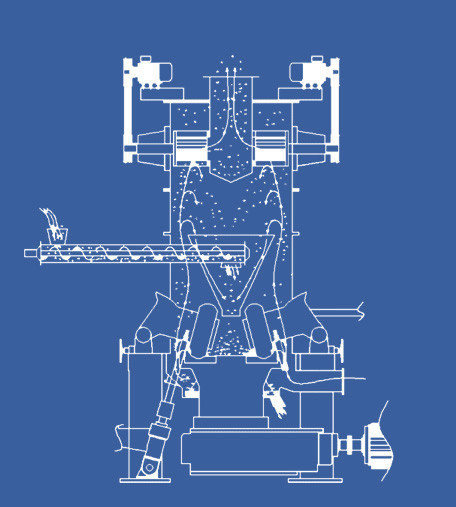 主電機通過減速機帶動磨盤轉動,同時風從進風口進入LUM超細立式磨機,物料經螺旋給料機下料口落在磨盤,在離心力的作用下,物料從磨盤向邊緣均勻移動,經過磨盤上的粉磨輥道區域時,受到磨輥的碾壓,大塊物料直接被壓碎,細粒物料受擠壓后形成料床進行粒間粉碎。被粉碎的物料繼續向磨盤邊緣移動,直到被風環處的強氣流帶走,而較大的顆粒物料又重新掉落到磨盤上繼續粉碎,氣流中的物料經過上部的分離器時,在轉子葉片的作用下,粗顆粒重新回到磨盤上粉磨,合格的細粉隨氣流一起出磨,被系統的集粉器收集,被收集到的粉料即為超細立磨磨出的產品。混入物料的鐵塊等雜物隨物料運動到磨盤邊緣時,由于自身重量大而不能被風吹起,跌落至磨機下腔被安裝在磨盤底部的刮料板刮入排渣口排出機外。